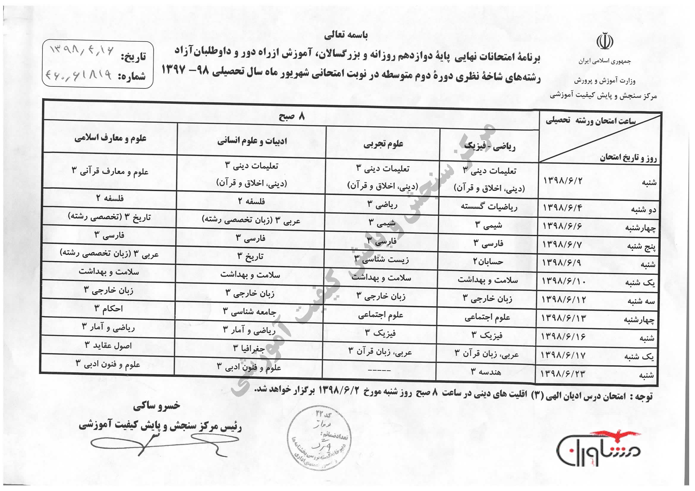 برنامۀ امتحان نهایی سال سوم دبیرستان شهریور ۹۸