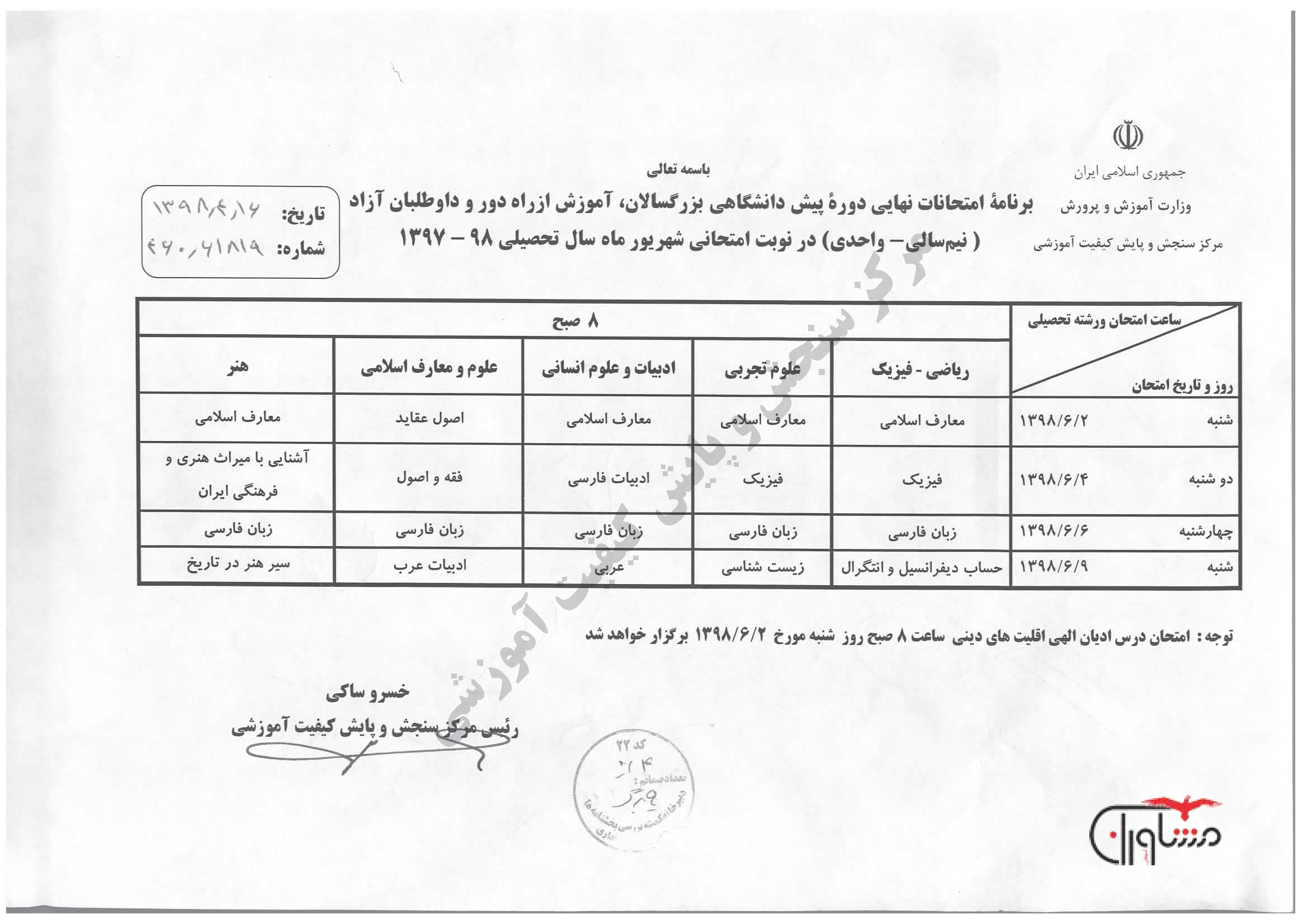 برنامه امتحانات نهایی پیش دانشگاهی بزرگسالان، آموزش از راه دور و داوطلبان آزاد (نیم سالی-واحدی) خرداد در سال تحصیلی ۹۸-۹۷