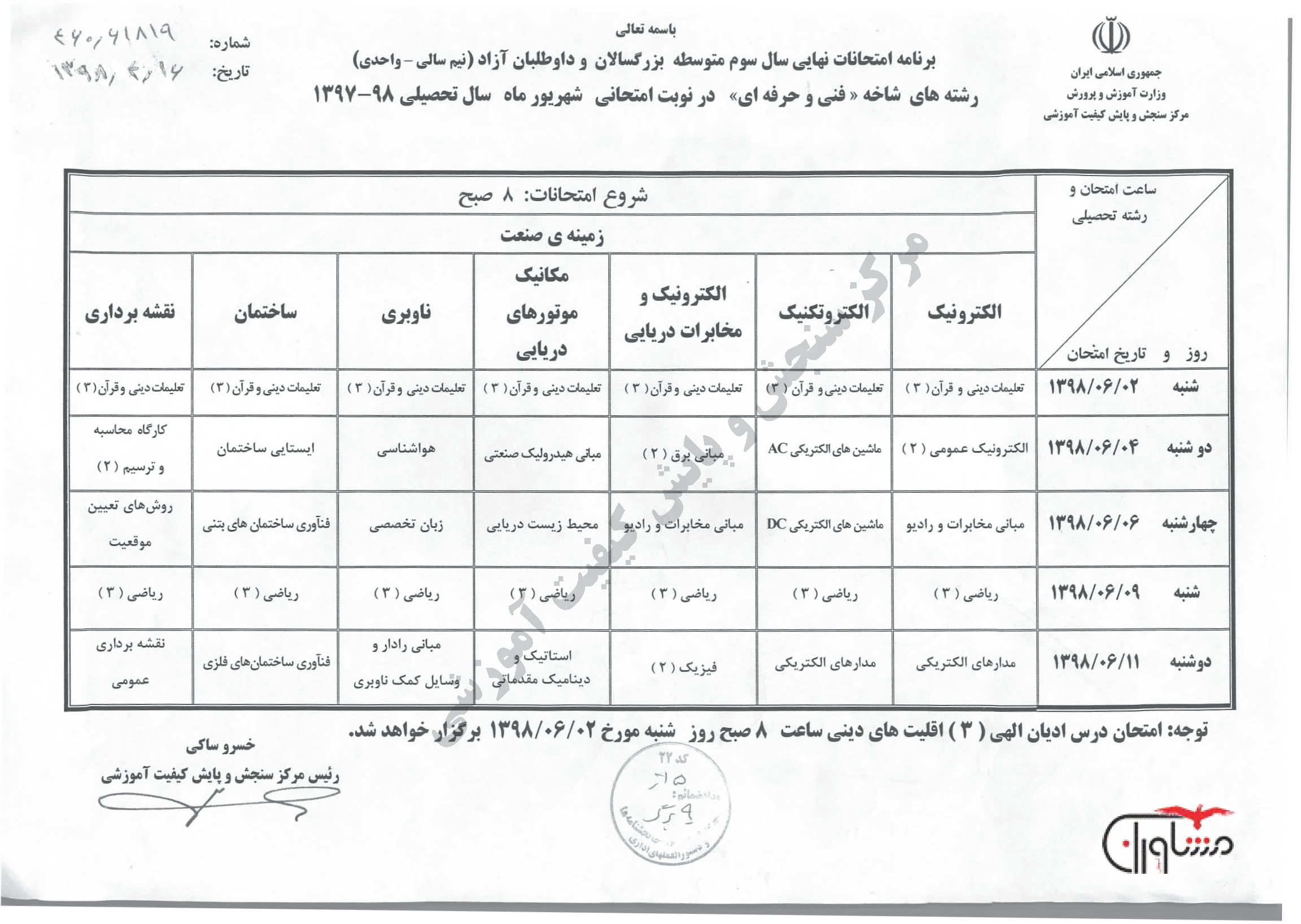 برنامۀ امتحان نهایی سال سوم متوسطه رشته‌های فنی‌ و حرفه‌ای شهریور ۹۸
